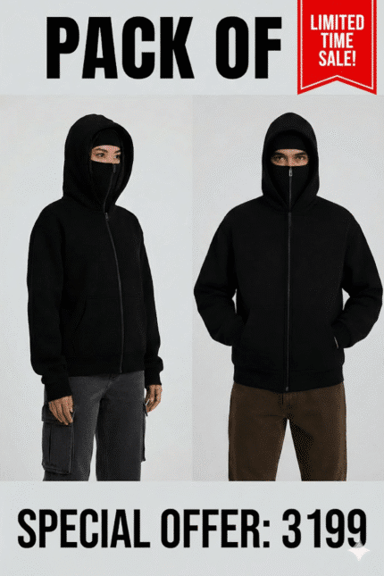 PACK OF 2 Unisex Balaclava Ninja Zipper Hoodie Jacket BLACK
